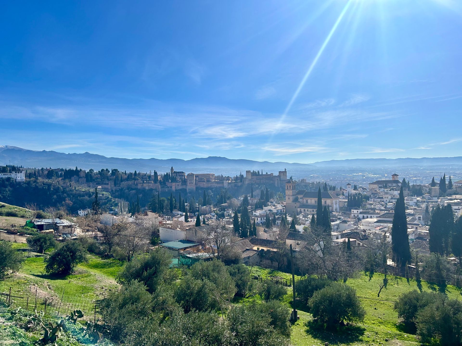 Mirador de San Miguel Alto. Links heb je een geweldig uitzicht over de Sierra Nevada en meer naar rechts zie je zowel het Alhambra als de stad liggen.